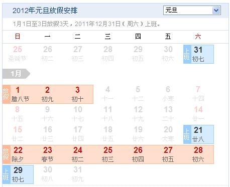 二、2012春節放假安排:2012年1 月22日至28日,放假7日。即1月22日(星期日,農歷除夕)、1月23日(星期一,農歷正月初一)、1月24日(星期二,農歷正月初二)為法定節假日,1月21日(星期六)、1月22日(星期日)公休調至1月25日(星期三)、1月26日(星期四),1月29日(星期日)公休調至1月27日(星期五)、28日(星期六)公休,1月21日、1月29日(星期日)照常上班。